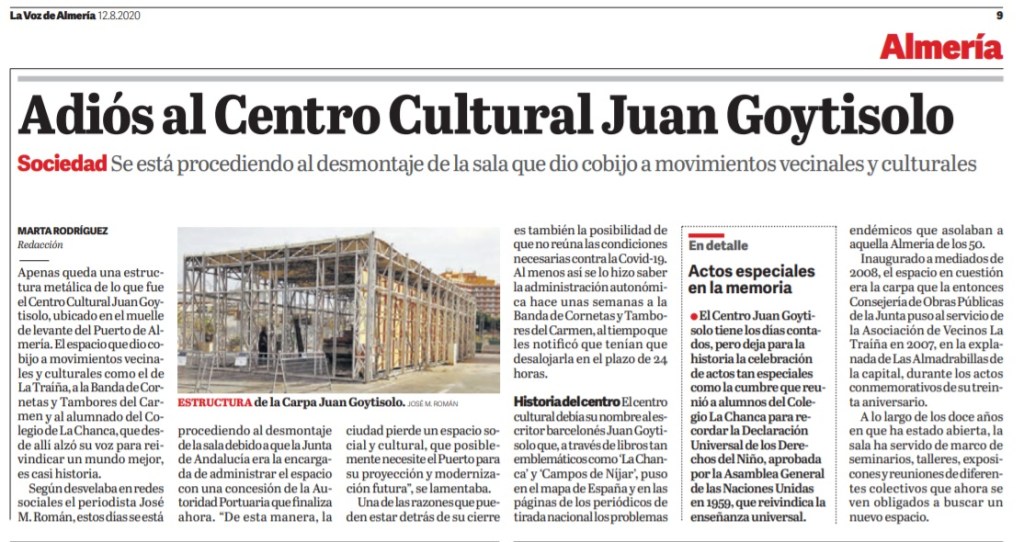 De esta manera la ciudad pierde un espacio social y cultural, que tenía vida desde hacía unos doce años, y que posiblemente necesite el Puerto para su proyección y modernización futura. Sería importante que la Autoridad Portuaria en el macro proyecto del Puerto – Ciudad contemple un marco cultural que supere al que ahora desaparece y que el nombre de Juan Goytisolo se recupere y no se pierda. Los almerienses lo agradecerían.