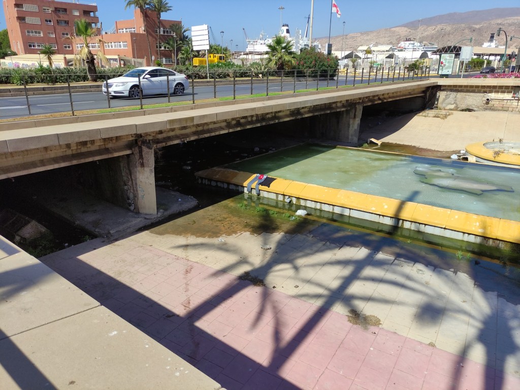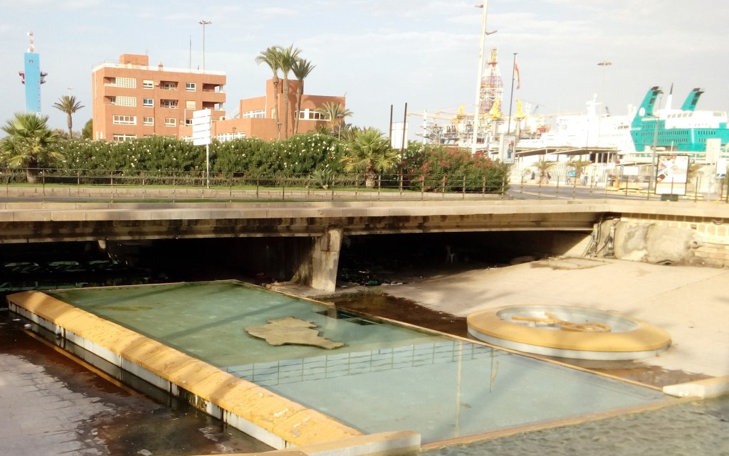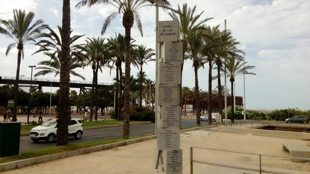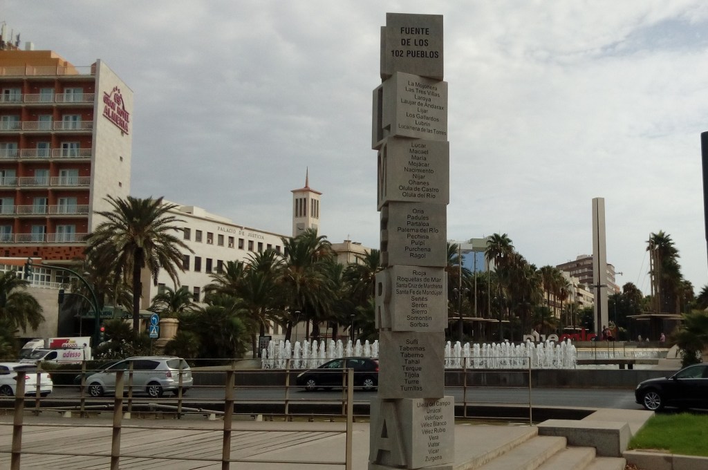 En el último tramo de la Rambla de Almería, entre la bifurcación de la vía Parque con la carretera de Ronda, se alza la ‘Fuente de los 102 pueblos‘ (ya 103, haciendo honor a los municipios de la provincia), que aunque limpia y aseada -hay mantenimiento-, languidece entre la suciedad y el olor fétido que provoca la desembocadura de la propia rambla, donde se almacena porquería, lodo pestilente y corren aguas fecales. Un lugar que brilló con fuerza y que ya prácticamente ha dejado de lucir y que tiene escaso uso ciudadano.