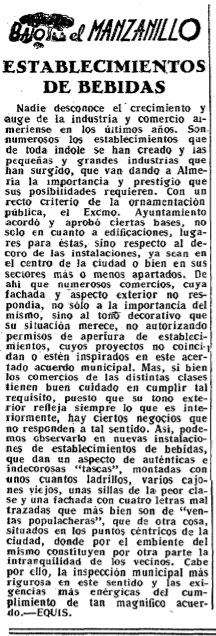 Nadie desconoce el crecimiento y auge de la industria y comercio almeriense en los úitimos años. Son numerosos los establecimientos que de toda índole se han creado y las pequeñas y grandes industrias que han surgido, que van dando a Almería la importancia y prestigio que sus posibilidades requieren. Con un recto criterio de la ornamentación pública, el Excmo. Ayuntamiento acordó y aprobó ciertas bases, no solo en cuanto a edificaciones, lugares para éstas, sino respecto al decoro de las instalaciones, ya sean en el centro de la ciudad o bien en sus sectores más o menos apartados. De ahí que numerosos comercios, cuya fachada y «aspecto exterior no respondía, no sólo a la importancia del mismo, sino al tono decorativo que su situación merece, no autorizando permisos de apertura de establecimientos, cuyos proyectos no coincidan o estén inspirados en este acertado acuerdo municipal. Mas, si bien los comercios de las distintas clases tienen buen cuidado en cumplir tal requisito, puesto que su tono exterior refleja siempre lo que es interiormente, hay ciertos negocios que no responden a tal sentido. Así, podemos observarlo en nuevas instalaciones de establecimientos de bebidas, que dan un aspecto de auténticas e indecorosas «tascas», montadas con unos cuantos ladrillos, varios cajones viejos, unas sillas de la peor clase y una fachada con cuatro letras mal trazadas que más bien son de «ventas populacheras», que de otra cosa, situados en los puntos céntricos de la ciudad, donde por el ambiente del mismo constituyen por otra parte la intranquilidad de los vecinos. Cabe por ello, la inspección municipal más rigurosa en este sentido y las exigencias más enérgicas del cumplimiento de tan magnifico acuerdo.