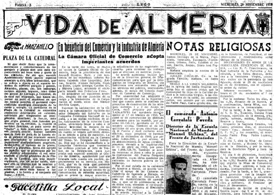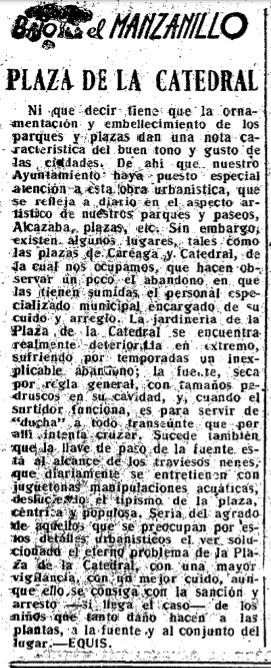 En 1951, ‘Bajo el Manzanillo’ denunciaba el abandono de la plaza de la Catedral de Almería: jardineria ‘deteriorada en extremo sufriendo por temporadas un inexplicable abandono’, la fuente ‘seca por regla general’ y ‘cuando el surtidor funciona es para servir de ducha a todo transeúnte’