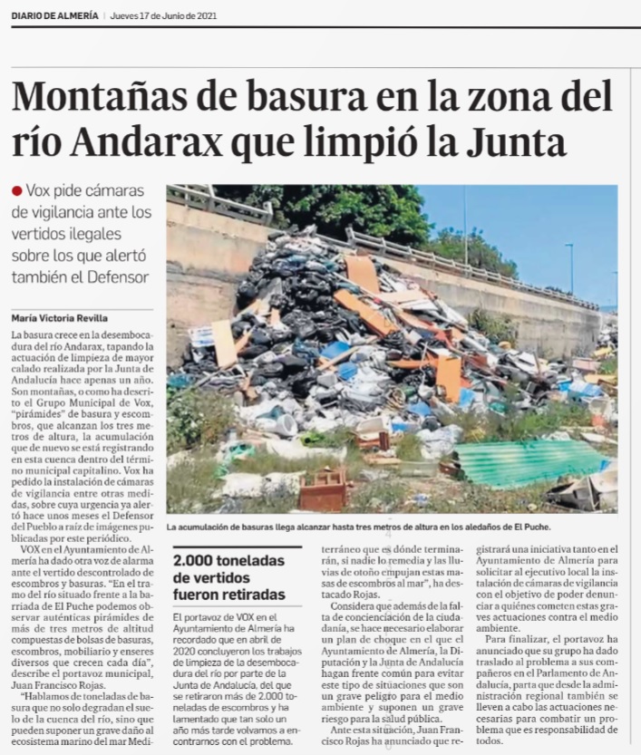 «Si el 5 de agosto de 2019 denunciábamos el estado de abandono y falta de mantenimiento del río Andarax a su paso por la ciudad y en la desembocadura en la bahía, constituyendo un auténtico peligro, más, poco después, con motivo de las última DANA o gota fría; ahora hemos de felicitar a quienes han hecho posible recuperar el cauce con un trabajo cuyos resultados están al alcance de todos con un simple paseo por el tramo final, desde El Puche hasta el delta. Los puentes han quedado diáfanos, y ha desaparecido la abundante vegetación (4-5 metros en algunas zonas) y la descontrolada basura, escombros, plásticos y desechos que se acumulaban por falta de mantenimiento. A lo largo del lecho se han plantado especies vegetales para la recuperación ambiental ordenada y se han establecido lagunas para diferentes especies que las ocupan. A simple vista, se ha hecho un buen trabajo, en tiempo récord y con resultados positivos. Ha sido una actuación urgente, rápida, y efectiva con una restauración ambiental con la que todos hemos ganado. Por eso, hay que reconocer el esfuerzo de la Consejería de Agricultura, Ganadería, Pesca y Desarrollo Sostenible de la Junta de Andalucía, que lidera la almeriense Carmen Crespo«.