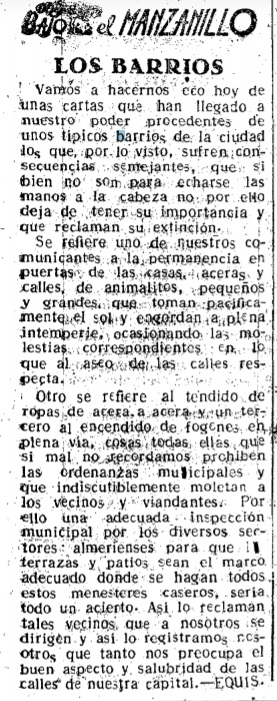 #BajoelManzanillo en diciembre de 1951 recogía la denuncia de vecinos de Almería sobre la presencia en los barrios de ‘animalitos, pequeños y grandes‘ en las puertas de las casas, el ‘tendido de ropas de acera a acera’, y el ‘encendido de fogones en plena vía‘, solicitando ‘una adecuada inspección municipal‘