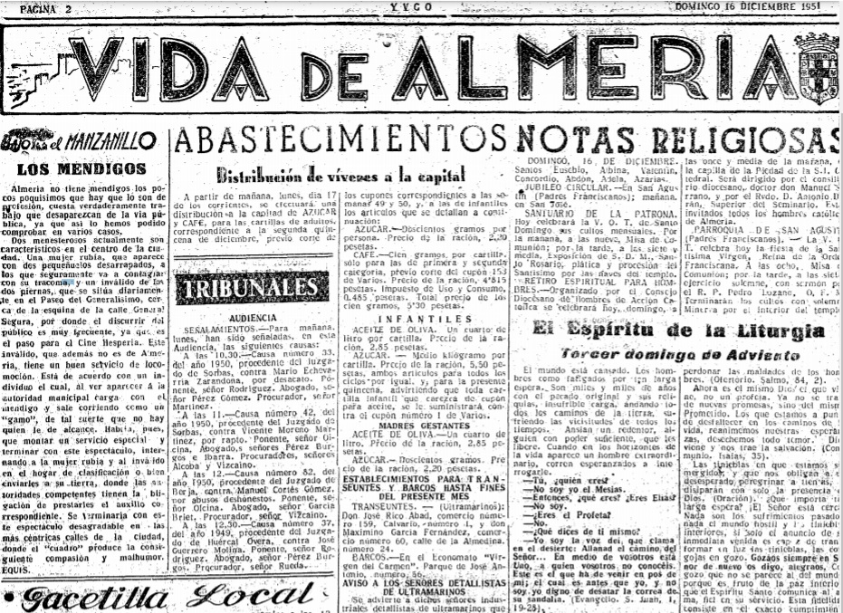 #BajoelManzanillo de mediados de diciembre de 1951 relataba las andanzas en pleno centro de la ciudad de dos de los «poquísimos» mendigos que había en Almería, un hombre y una mujer. El varón se trataba de un «inválido que tiene un buen servicio de locomoción. Está de acuerdo con un individuo el cual, al ver aparecer a la autoridad municipal, carga con el mendigo y sale corriendo como un ‘gamo'»