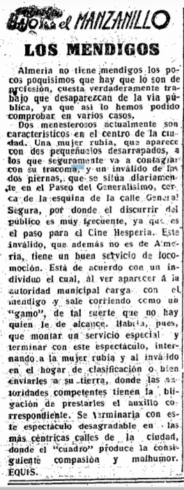 Dos menesterosos actualmente son característicos en el centro de la ciudad. Una mujer rubia, que aparece con dos pequeñuelos desarrapados, a los que seguramente va a contagiar con su tracoma, y un inválido de las dos piernas, que se sitúa diariamente en el Paseo del Generalísimo, cerca de la esquina de la calle General Segura, por donde el discurrir del público es muy frecuente, ya que es el paso para el Cine Hesperia. Este inválido, que además no es de Almería, tiene un buen servicio de locomoción. Está de acuerdo con un individuo el cual, al ver aparecer a la autoridad municipal carga con el mendigo y sale corriendo como un ‘gamo’, de tal suerte que no hay quien le dé alcance. Habría, pues, que montar un servicio especial y terminar con este espectáculo, internando a la mujer rubia y al inválido en el hogar de clasificación o bien enviarles a su tierra, donde las autoridades competentes tienen la obligación de prestarles el auxilio correspondiente. Se terminaría con este espectáculo desagradable en las más céntricas calles de la ciudad, donde el ‘cuadro’ produce la consiguiente compasión y malhumor.