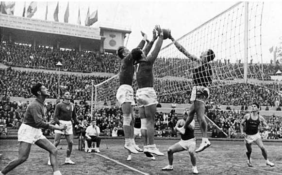 Partido de voleibol jugado en un estadio de fútbol. Eran los comienzos.