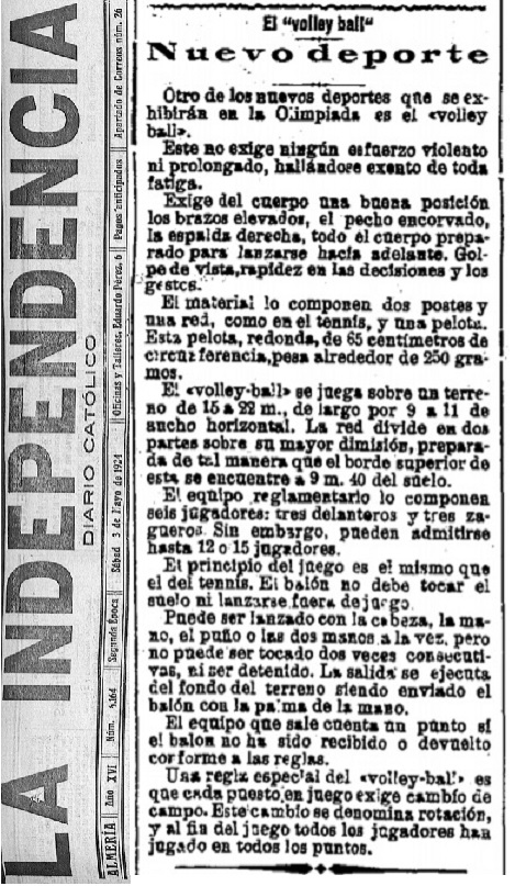 El sábado, 3 de mayo de 1924, ‘La Independencia’, en su contraportada (ejemplar de cuatro páginas), en la columna central se decía como titular “El ‘volley ball’. Nuevo deporte”, con el siguiente texto: