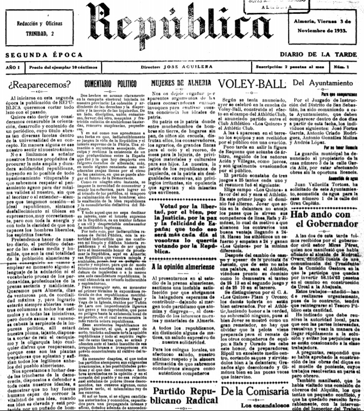 Es significativo que estas cuatro referencias históricas del voleibol español tengan como soporte la prensa almeriense, más cuando en general, los medios de comunicación daban la espalda en sus páginas a esta modalidad deportiva durante los años 20 a 40 del siglo XX. Nada menos que tres periódicos – ‘La Independencia’, ‘República’ y ‘Diario de Almería’ – hacen mención o recogen reseñas de la época, constituyendo una huella imprescindible para conocer el nacimiento del vóley en España.