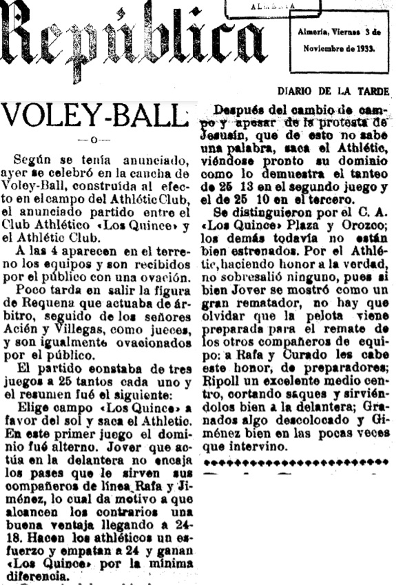 Según se tenía anunciado, ayer se celebró en la cancha de voley – ball, construida al efecto, el anunciado partido entre el Club Athlético “Los Quince” y el Athlétic Club. A las 4 de la tarde aparecen en el terreno los equipos y son recibidos por el público con una ovación. Poco tarda en salir la figura de Requena que actuaba de árbitro, seguido de los señores Acién y Villegas, como jueces, y son igualmente ovacionados por el público. El partido constaba de tres juegos a 25 tantos cada uno y el resumen fue el siguiente: Elige campo “Los Quince” a favor del sol y saca el Athlétic. En este primer juego el dominio fue alterno. Jover, que actúa en la delantera, no encaja los pases que le sirven sus compañeros de línea, Rafael y Jiménez, lo cual da motivo a que alcancen los contrarios una buena ventaja llegando a 24 – 18. Hacen los athléticos un esfuerzo y empatan a 24, pero ganan “Los Quince” por la mínima diferencia. Después del cambio de campo y a pesar de la protesta de Jesulín, que de esto no sabe una palabra, saca el Athlétic, viéndose pronto su dominio como lo demuestra el tanteo de 25 – 13 en el segundo juego y el 25 – 10, en el tercero. Se distinguieron por el C. A. “Los Quince”, Plaza y Orozco; los demás todavía no están bien entrenados. Por el Athlétic, haciendo honor a la verdad, no sobresalió ninguno, pues si bien Jover se mostró como un gran rematador, no hay que olvidar que la pelota viene preparada para el remate de los otros compañeros de equipo; a Rafa y Curado les cabe este honor de preparadores. Ripoll un excelente medio centro, cortando saques y sirviéndolos bien a la delantera; Granados algo descolocado y Giménez bien en las pocas veces que intervino”.