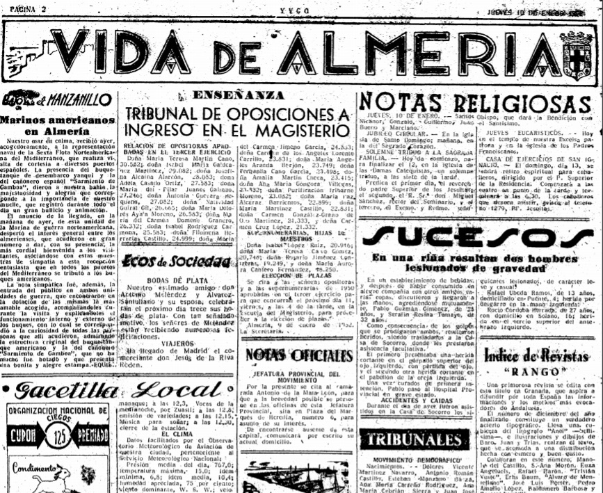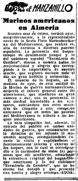 Nuestro mar en calma recibió ayer -9 de enero de 1952-, acogedoramente, a la representación naval de la Sexta Flota Norteamericana del Mediterráneo, que realiza visita de cortesía a diversos puertos españoles. La presencia del buque – tanque de desembarco yanqui y la del cañonero español «Sarmiento de Gamboa», dieron a nuestra bahía la majestuosidad y alegría que corresponde a la importancia de nuestro muelle, que registró durante todo el día un gran bullicio y animación.
