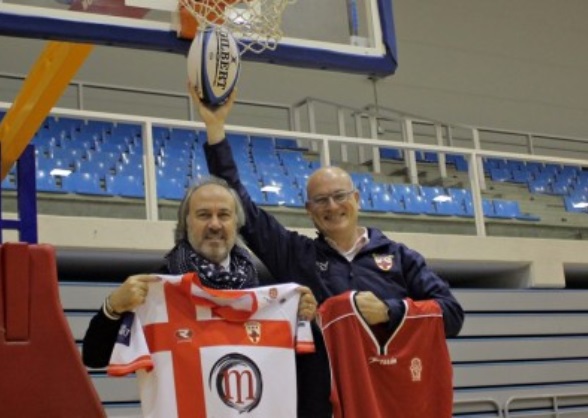 Hermanamiento baloncesto y rugby. Pascual Sánchez con Miguel Palanca, en 2016, C. B. Almería y Unión Rugby Almería.