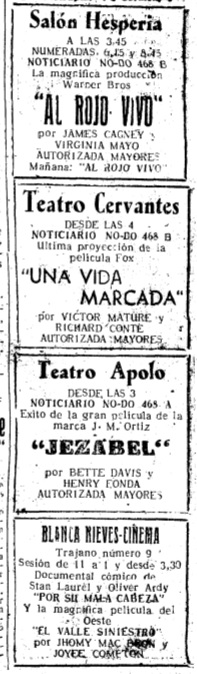 - Blanca Nieves Cinema (C/ Trajano,9, inaugurado el 6 de enero de 1952). Documental cómico de Stan Laurel y Oliver Ardy ‘Por su mala cabeza‘ y la película del Oeste ‘El valle siniestro‘, por Johnny Mack Brown, Joyce Compton y Georges ‘Gabby’ Hayes. Todos los públicos.