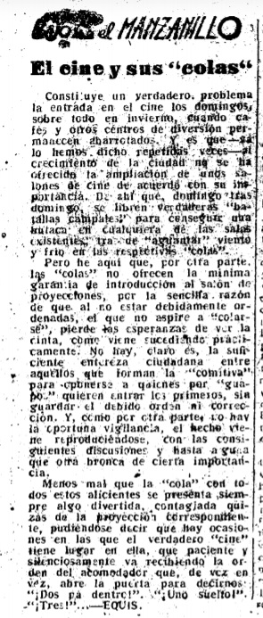 #BajoelManzanillo, recién estrenado 1952, relataba las «batallas campales» para conseguir una butaca en los cines de la época (Cervantes, Apolo, Hesperia y Blanca Nieves Cinema), «aguantando» viento y frío en las «colas» multitudinarias y a quienes por «guapos» querían entrar los primeros. Pacientemente había que aguardar a la voz del acomodador: «¡Dos pá dentro!», «¡Uno suelto!», «¡Tres!»…