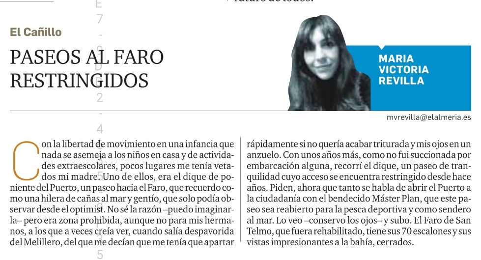 Diario de Almería, miércoles, 9 de diciembre de 2020, página de ‘Opinión’. ‘El cañillo’, de María Victoria Revilla sobre ‘Paseos al Faro restringidos’.
