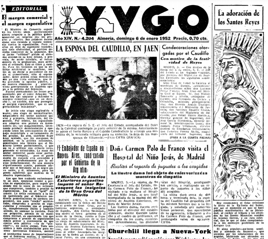 Llegaron los Reyes de Oriente, con la brillantez y suntuosidad de siempre. Su cabalgata, una gran policromía de flores y bengalas, recorrió en esta madrugada silenciosa, las calles de la ciudad, visitando, sin detenerse ni «despistarse», todos los hogares almerienses. En todos dejaron sus huellas más o menos notables. Abundaron los balones de reglamento, los caballos, las bicicletas, las muñecas, cochecitos y los pitos de muchas y variadas clases para los niños y niñas; y, para los mayores, tampoco faltó la «tradicional» corbata, la cartera, la tabaquera, el bolso, los guantes o la maquinilla de afeitar, etc.