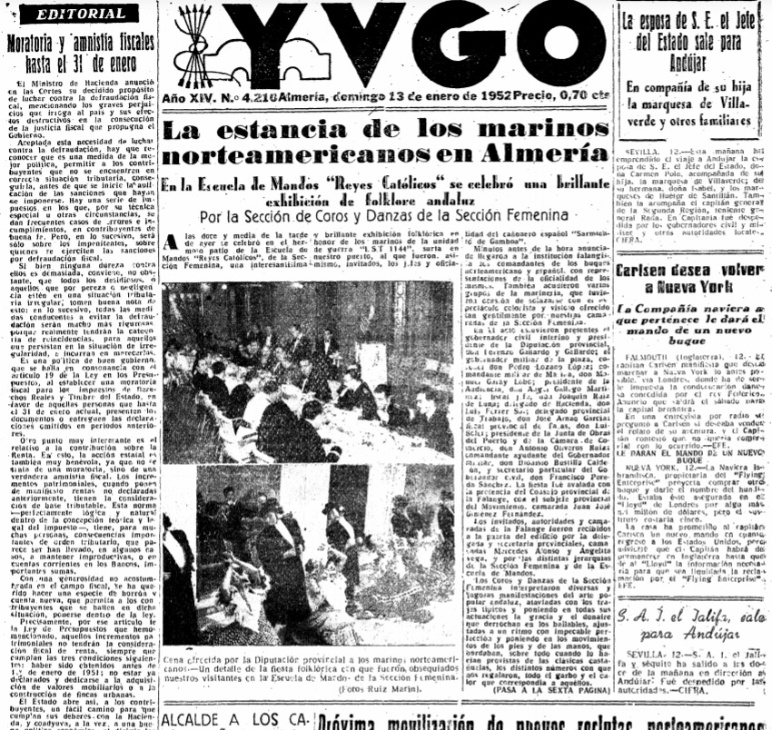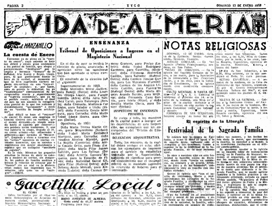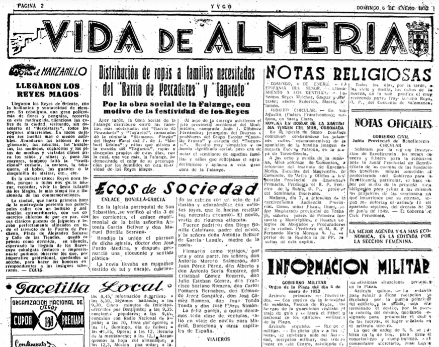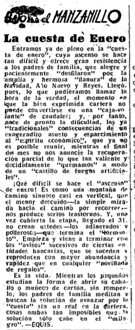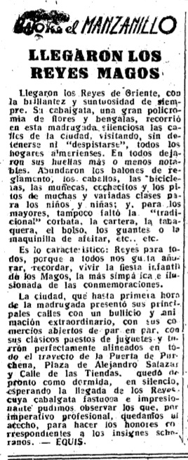 #BajoelManzanillo del día de Reyes de 1952 describía la «cabalgata fastuosa e impresionante» y el paso de los «soberanos» por los hogares almerienses, para una semana después reflejar el «ascenso difícil» de la «cuesta de enero», que «ofrece gran resistencia a los padres de familia, que alegre y pacientemente ‘desfilaron’ por la amplia y hermosa ‘llanura’ de la Navidad, Año Nuevo y Reyes