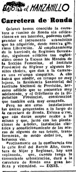 Quienes hemos conocido la carretera o camino de Ronda sin edificaciones en sus laterales, podemos comprender el incremento urbanístico que ha adquirido desde nuestra gloriosa Liberación. Al emplazamiento de la barriada de Regiones Devastadas, siguieron edificios tan espléndidos como la Escuela de Mandos de la Sección Femenina (hoy Museo Arqueológico), el Instituto Provincial de Higiene (actual Delegación de Salud) y algunos bonitos chalets, que dan a la carretera una estampa simpática. A ello habrá que añadir, en tiempo no muy lejano, la Residencia Sanatorial del Instituto Nacional de Previsión (actual Bola Azul), hermoso edificio que se encuentra muy adelantado, y el Orfelinato de la Diputación Provincial (llamado Hogar Provincial posteriormente), construcción que también está muy avanzada.