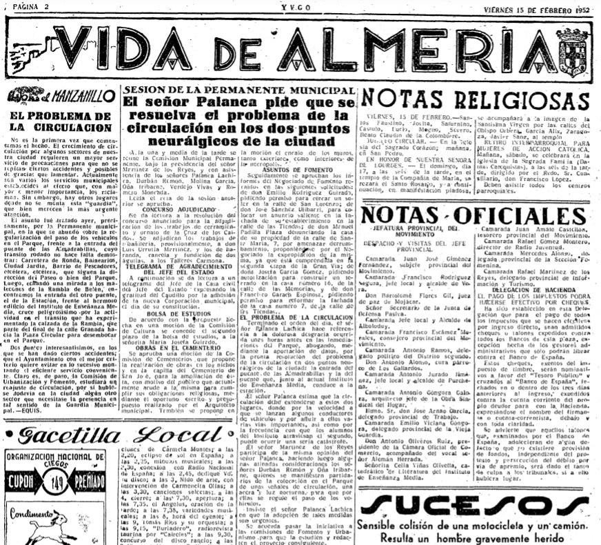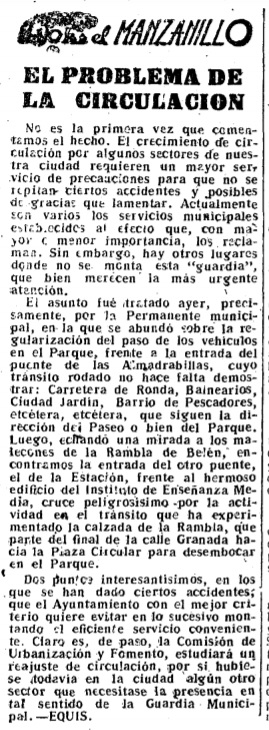 #BajoelManzanillo refleja los problemas que provocaba la circulación en la Almería de 1952, a raíz de una serie de accidentes que habían ocupado la actualidad. En concreto destaca la necesaria regularización del tráfico en la confluencia del Parque, la Rambla de Belén – Paseo – Reina Regente y carretera de Ronda – puente de Las Almadrabillas, dirección Ciudad Jardín – Zapillo