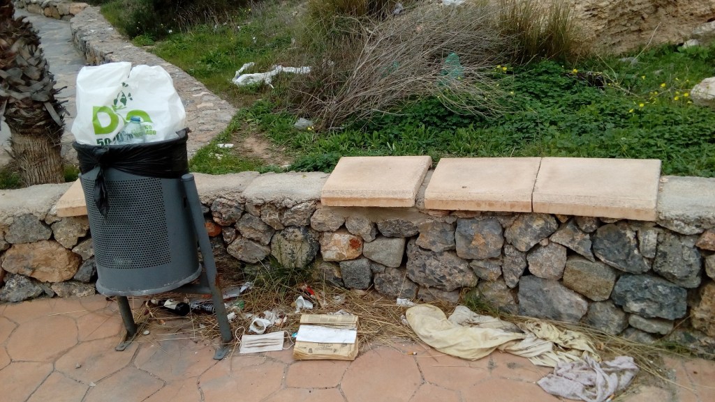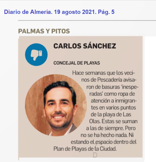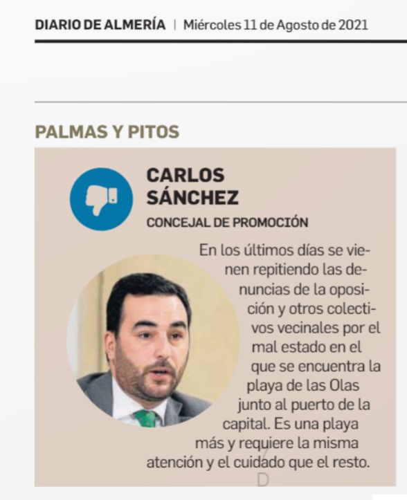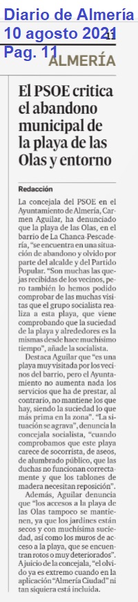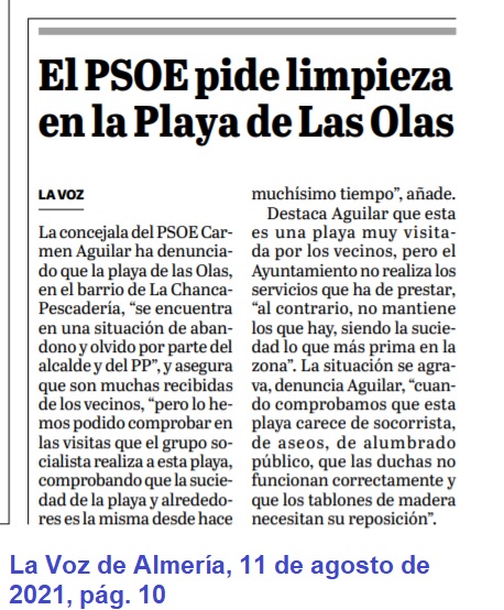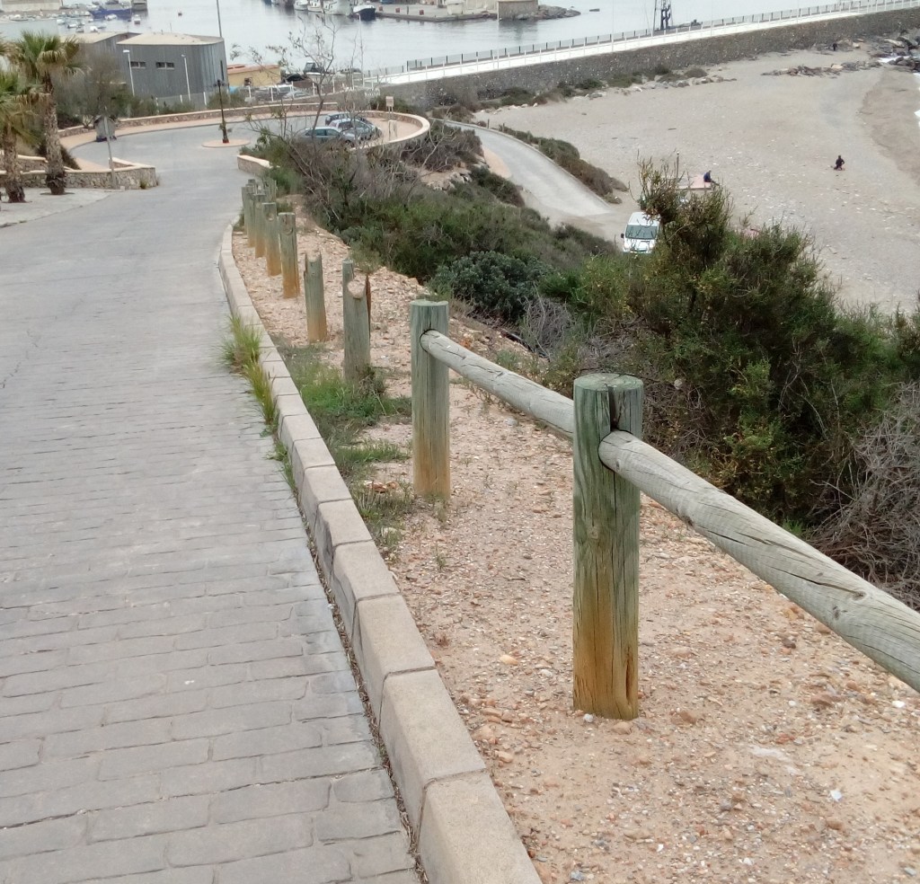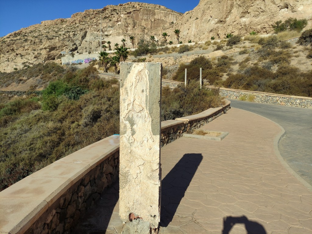 El Ministerio de Medio Ambiente, a través de la Dirección General de Costas de la Secretaría de Estado de Aguas y Costas, el 8 de marzo de 2002, inauguró, como indica una placa conmemorativa, la recuperación ambiental de la Playa de Las Olas, una obra que era necesaria y que puso en valor toda la zona con un acceso fácil para peatones y vehículos, espacio para aparcamiento, una plazoleta, jardinería y papeleras, ducha pública, etc. Ha pasado el tiempo, casi dos décadas, y, como suele ocurrir con demasiada frecuencia en Almería, no hay administración que se haga cargo de un correcto mantenimiento y la playa y sus alrededores han caído en el más profundo abandono y deterioro: vallas de protección rotas, muros resquebrajados y que se vienen abajo, basuras acumuladas, papeleras y contenedores saturados, oquedades con demasiada porquería, plantas secas, la jardinería ya casi inexistente, alcorques inservibles sin especies arbóreas ni instalación de riego, la farola destrozada sin iluminación…un panorama desolador, que ya merece una actuación puntual e integral, sin olvidar lo sencillo y cotidiano, la limpieza y aseo del entorno.