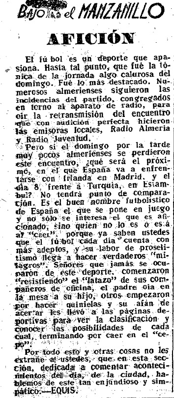 Pero si el domingo por la tarde muy pocos almerienses se perdieron este encuentro, ¿Qué será el próximo, en el que España va a enfrentarse con Irlanda en Madrid (ganó España por 6-0, 1 de junio de 1952, en Chamartín, partido amistoso), y el día 8, frente a Turquía (0-0 fue el resultado, 8 de junio de 1952), en Estambul? No tendrá punto de comparación. Es el buen nombre futbolístico de España el que se pone en juego y no solo se interesa el que es aficionado, sino quien no lo es o está al «caer», porque ya saben ustedes que el fútbol cada día cuenta con más adeptos, y su labor de proselitismo llega a hacer verdaderos «milagros». Señores que jamás se ocuparon de este deporte, comenzaron «resistiendo» al «latazo» de sus compañeros de oficina, el padre oía en la mesa a su hijo, otros empezaron por hacer quinielas y a su afán de acertar les llevó a las páginas deportivas para ver la clasificación y conocer las posibilidades de cada cual, terminando por caer en el «cepo».
