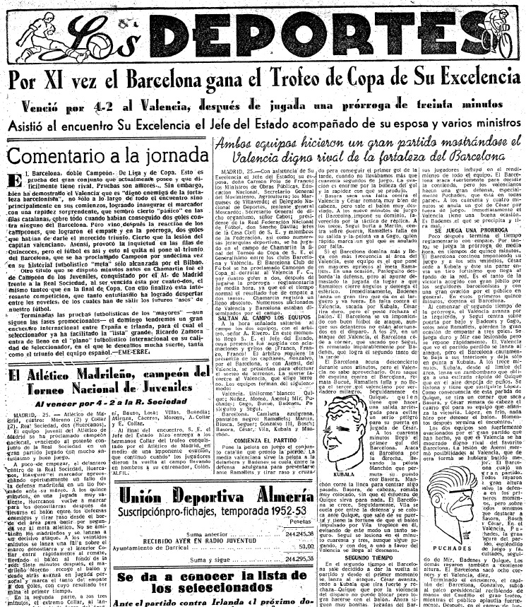 Final de Copa. Barcelona jugó con el siguiente ‘once’: Ramallets, Martín, Biosca, Seguer, Gonzalvo III, Bosch, Basora, Kubala, César, Vila y Manchón (entrenador, Ferdinand Daucik). Y, el Valencia alineó a Quique Martín, Suñer, Monzó, Asensi, Mir, Puchades, Gago, Pasieguito, Badenes, Buqué, y Seguí (entrenador, Jacinto Quincoces).
