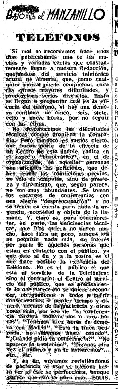 Si mal no recordamos, hace unos días publicábamos una de las muchas y muy variadas cartas que constantemente llegan a nuestra Redacción, quejándose del servicio telefónico actual de Almería, que, como cualquier mortal puede comprobar, cada día ofrece mayores dificultades, y proporciona serios disgustos. Hasta se llegan a preguntar cuál es la eficacia del teléfono, si hay una demora continua de cinco, seis, siete, ocho y nueve horas, por no seguir con las cifras.