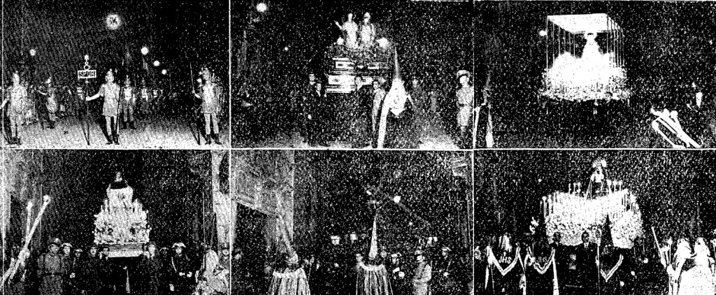 Las cofradías desfilaron anoche, en las cuales se percibió el entusiasmo y el esfuerzo realizados por ellas. La de los Estudiantes, de penitentes con cinturones y sandalias de esparto nos ofreció una sección de romanos, que ha venido a enriquecer, no solo la ornamentación de la Hermandad, sino a incrementar su valor litúrgico. La de Nuestro Padre Jesús Nazareno y la Santísima Virgen de la Amargura, que ha ampliado el número de sus valiosas túnicas, ha adquirido una artística corona para la Virgen y ha sumado el «paso» de la Verónica, causando la gratísima impresión de un desfile serio y penitencial.
