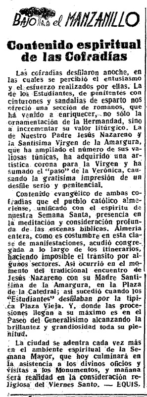 #BajoelManzanillo nos describe en sus columnas periodísticas del jueves y sábado de Pasión cómo fue la Semana Santa almeriense de 1952. Un cielo gris con tiempo inseguro privó a la ciudad del desfile del Santo Entierro, celebrándose el resto de procesiones: Prendimiento, Estudiantes, Encuentro, Banca y Oficinas, Angustias, Silencio y Virgen de los Dolores. También el sábado tuvo lugar el cortejo de la Soledad de la Virgen protagonizado por mujeres