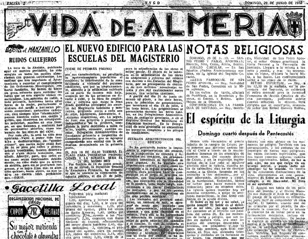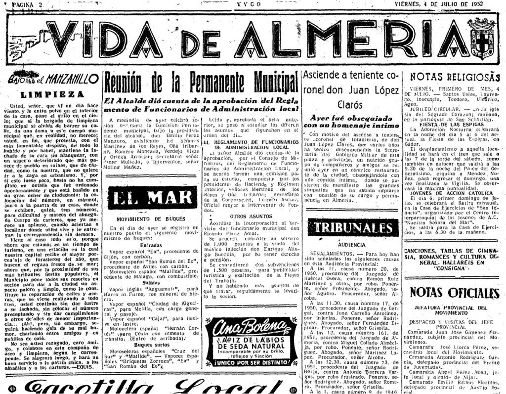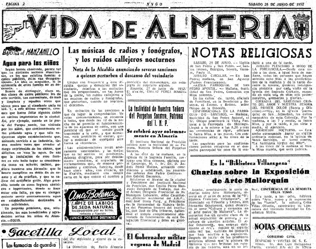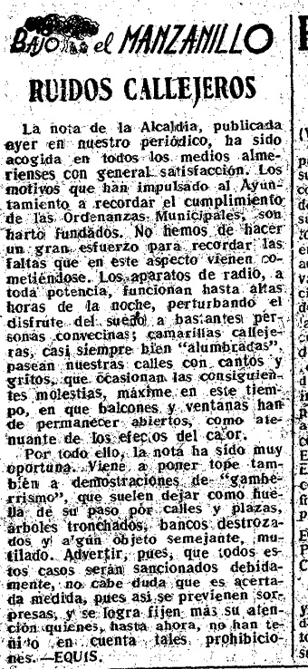 La nota de la Alcaldía, publicada ayer en nuestro periódico, ha sido acogida en todos los medios almerienses con satisfacción. Los motivos que han impulsado al Ayuntamiento a recordar el cumplimiento de las Ordenanzas Municipales, son harto fundadas. No hemos de hacer un gran esfuerzo para recordar las faltas que en este aspecto vienen cometiéndose. Los aparatos de radio, a toda potencia, funcionan hasta altas horas de la noche, perturbando el disfrute del sueño a bastantes personas convecinas; camarillas callejeras, casi siempre bien «alumbradas» pasean nuestras calles con cantos y gritos, que ocasionan las consiguientes molestias, máxime en este tiempo, en que balcones y ventanas han de permanecer abiertos, como atenuante para los efectos del calor.