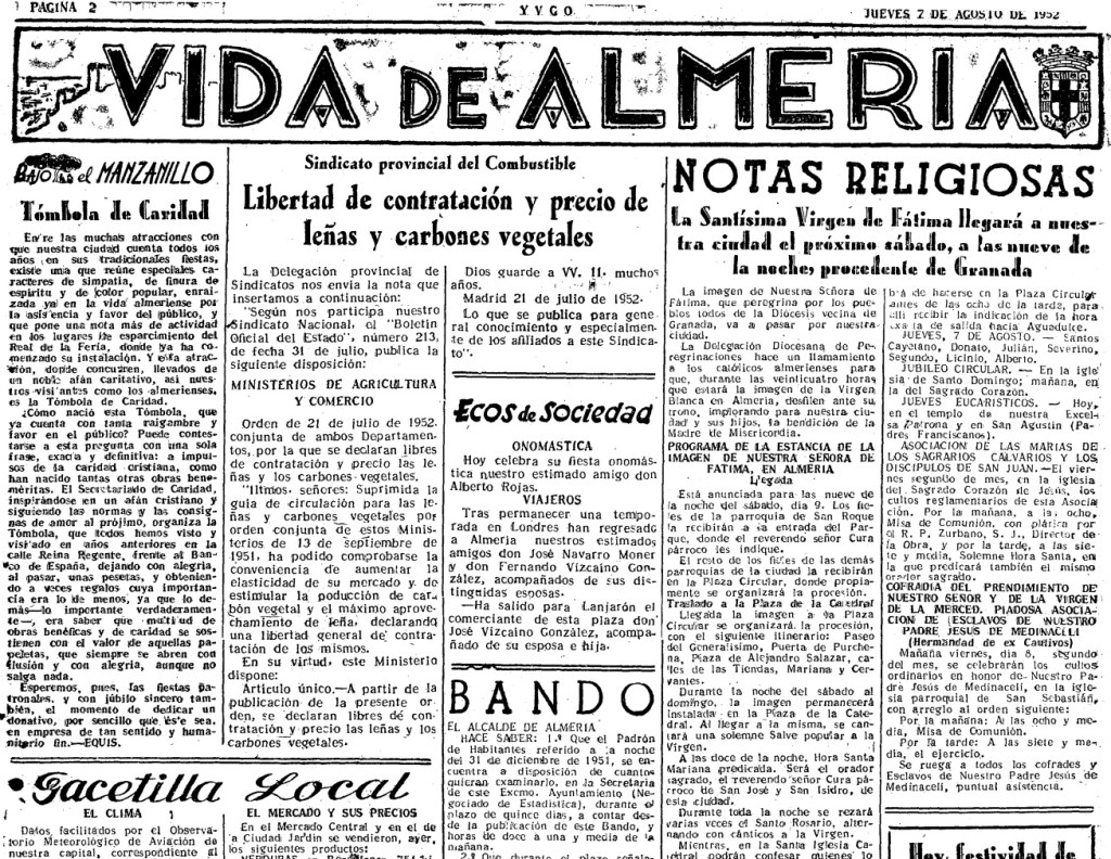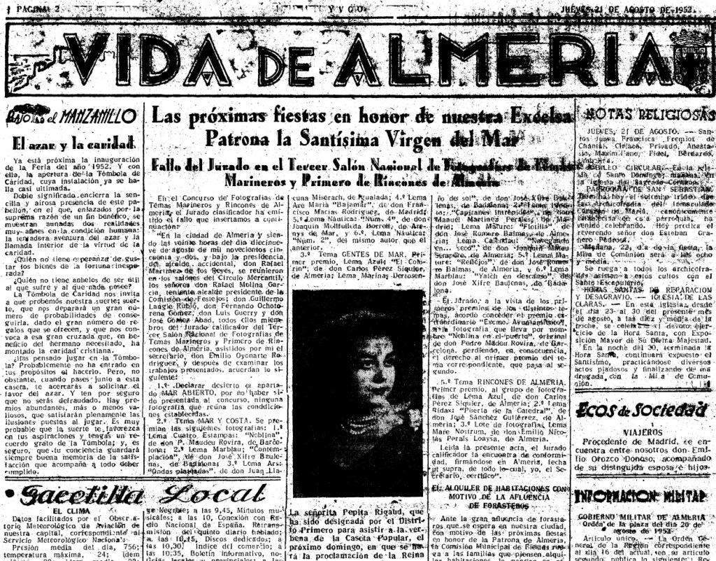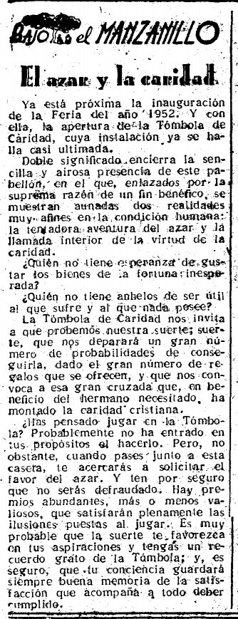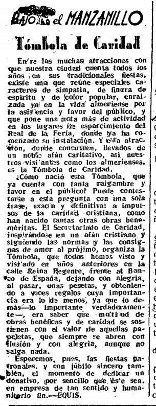 #BajoelManzanillo en agosto de 1952 alude al ambiente que en la Feria de Almería ponía la Tómbola de Caridad, que reunía «especiales características de simpatía, finura de espíritu y color popular, enraizada en la vida de los almerienses por la asistencia y favor del público». Decía el comentario de EQUIS en su columna diaria del ‘Yugo’