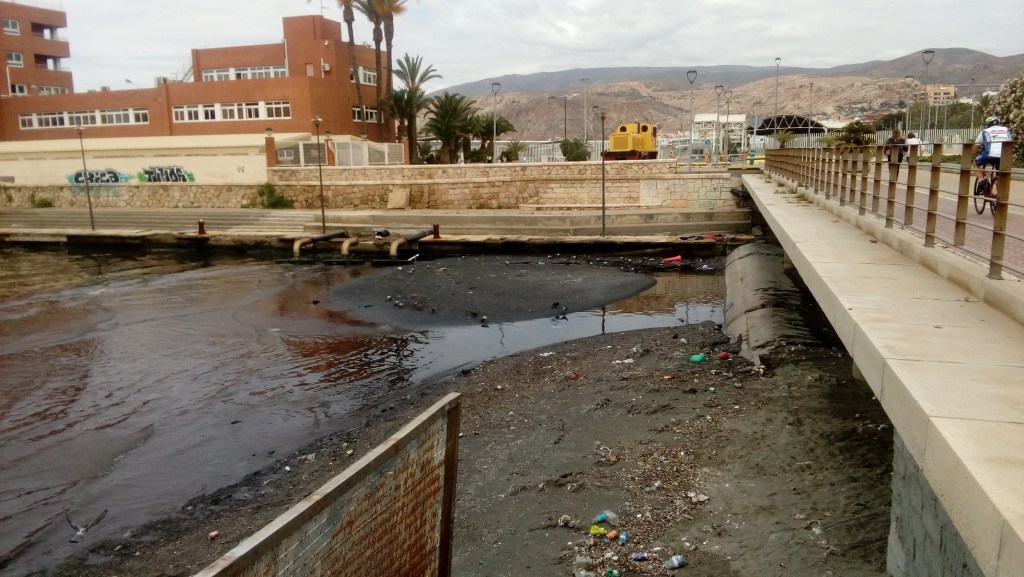 Desembocadura de la Rambla con la playa de Las Almadrabillas, zona conocida por ‘La ballena de Gabriel’, a los pies del Cable Inglés en plena restauración y llamado a ser foco turístico. Bajo el puente que une la zona portuaria con el Paseo Marítimo de Carmen de Burgos, por donde antes pasaba el tren y por donde ahora lo hacen cientos de ciudadanos al día en su marcha saludable, paseos o prácticas deportivas. Un espacio de una belleza palpable, a pesar de los fracasos municipales, entre otros, los del geiser del que nunca más se supo. Pues bien, ahí, justo ahí, a las 11:30 horas de este jueves, 27 de mayo de 2021, cuando la marea estaba más baja de lo normal, el espectáculo era tercermundista, de abandono, bochornoso, con un olor insoportable y el discurrir permanente de aguas fecales, vertidas sin control alguno al mar.