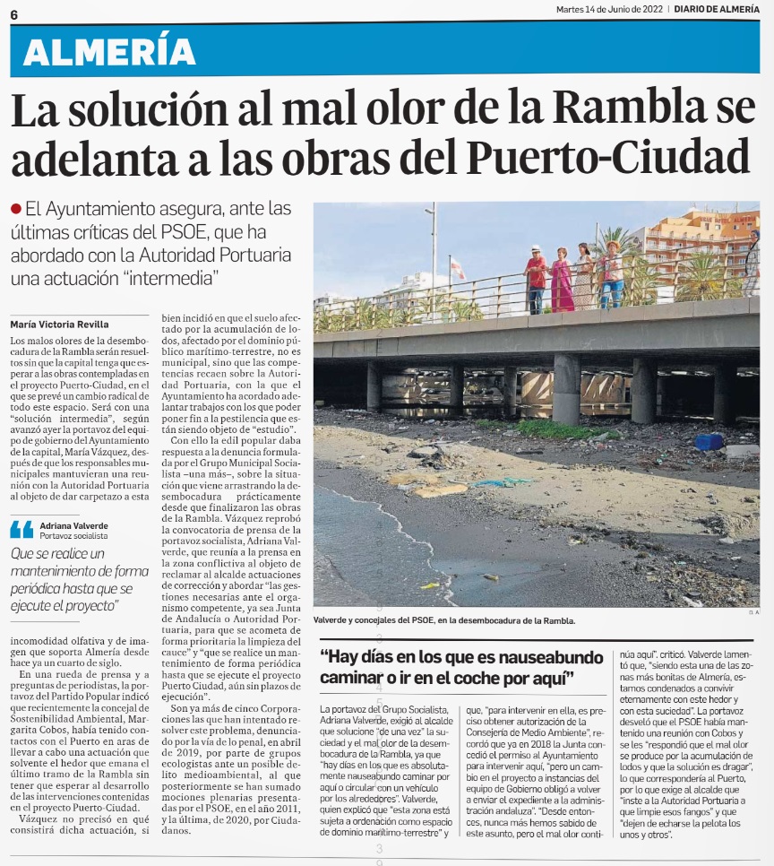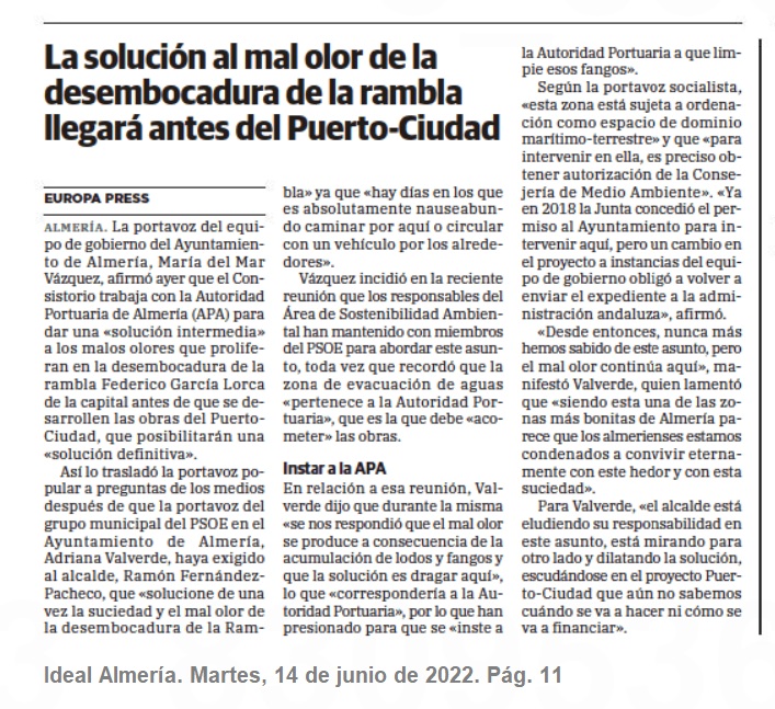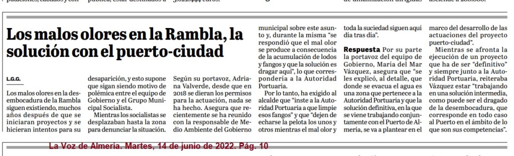 Almería exige una respuesta urgente y todos sus políticos o responsables municipales, autonómicos o del organismo portuario, deberían ponerse de acuerdo, manos a la obra, y terminar de una vez por todas con esta situación. Como escribíamos en agosto de 2020, copio literalmente: «En fin, un mar de despropósitos que es urgente acometer, necesario afrontar definitivamente y erradicar, como sea, la insalubridad, los olores pestilentes y la imagen lamentable de la desembocadura de la Rambla. Autoridad Portuaria y Ayuntamiento de Almería -añadimos ahora también a Junta de Andalucía– deberían ponerse manos a la obra de forma contundente, urgente y eficaz. Lo esperamos«. ¡Ya está bien!