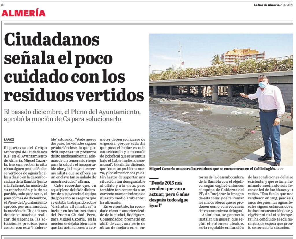 Las quejas de algunos partidos políticos de la oposición municipal no han ido más allá de las apariciones en prensa o fotografías in situ, además del acuerdo del pleno del ayuntamiento de Almería del 18 de diciembre de 2020 que por unanimidad apoyó la moción de Ciudadanos, y que, según decían «permitirá afrontar las obras necesarias para acabar con el mal olor y mantener limpia la desembocadura de la Rambla, incluso recuperar el géiser que por poco tiempo funcionó«. Después, nada se ha sabido. Y, han pasado ya cinco meses. El verano está asomando y el problema aumentará con las altas temperaturas.