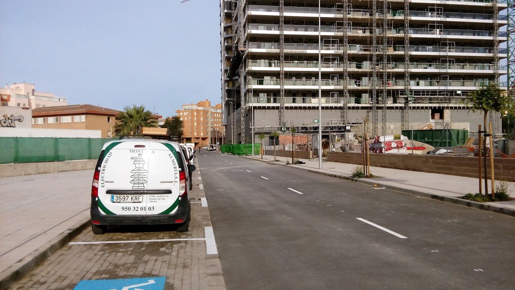 La nueva calle Abogado de Oficio, que está pavimentada, con arbolado y aceras, señalizada debidamente, dará acceso a los dos edificios, tanto a los portales para entrar a las numerosas viviendas como a los sótanos, donde hay parking para uso residencial y de los usuarios del supermercado que no tardará en inaugurarse. Además, la vía, que transcurre casi paralela a la carretera de Sierra Alhamilla, regulará mejor la circulación de la zona, ya que desemboca en una futura rotonda, junto a la pasarela de la Estación, que lo más seguro es que desaparezca, y donde, en principio, hay proyectada otra calle que conectará con la plaza Manuel Fraga, entre las dos estaciones, la intermodal y la vieja.