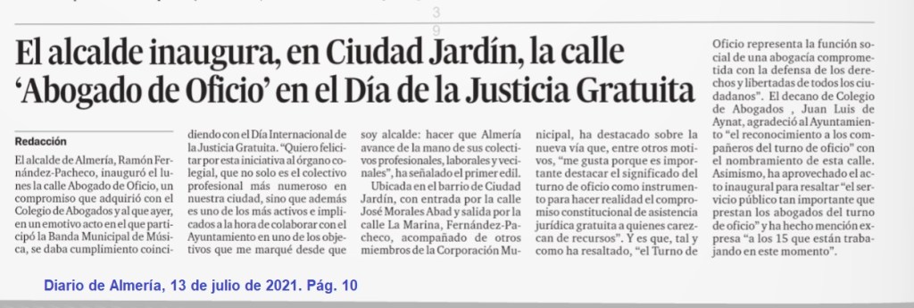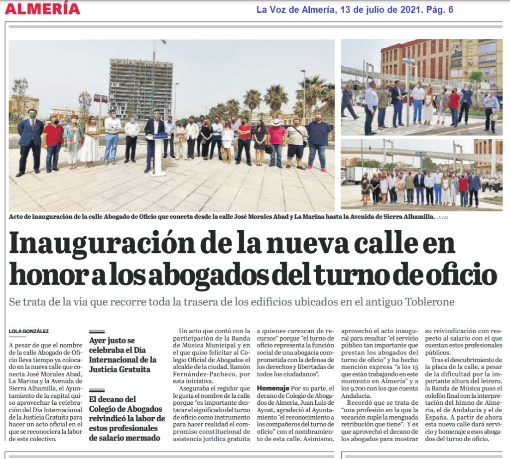 La calle fue inaugurada por el alcalde, Ramón Fernández – Pacheco, en un acto celebrado el 12 de julio de 2021, coincidiendo con el Día Internacional de la Justicia Gratuita. Asistieron amplias representaciones del Ayuntamiento y del Colegio de Abogados. Con ésta última institución, el alcalde había adquirido compromiso para denominar a la calle, Abogado de Oficio. La prensa local, como puede verse al final del texto, dio debida cuenta de la ceremonia de inauguración, con la participación de la Banda Municipal de Música.