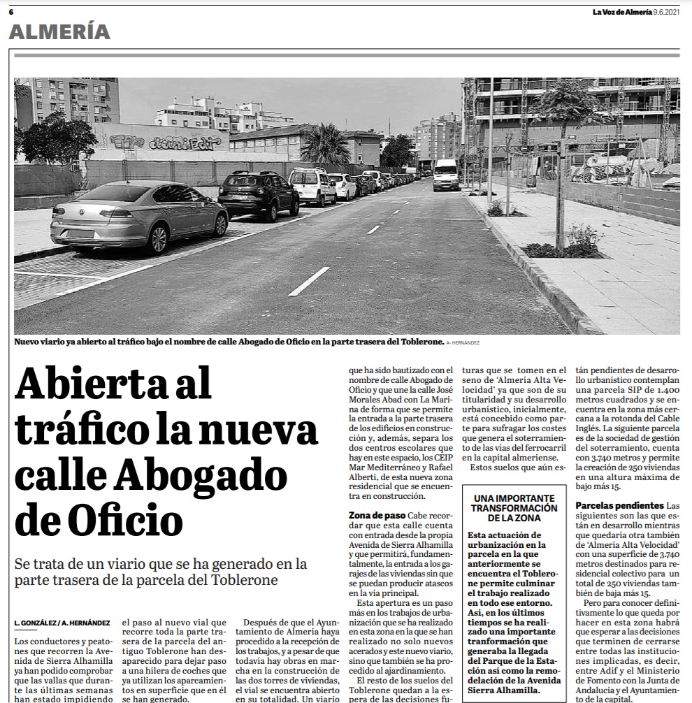 Abogado de Oficio. Ese es el nombre de la calle recién abierta, con rótulo incluido, prolongación de la denominada Cable Inglés y que une las vías José Morales Abad y de La Marina. Es el vial consecuencia de la urbanización de los terrenos dejados por el Toblerone (antiguo silo de mineral de hierro, construido por la Compañía Andaluza de Minas en 1973, junto a la estación del tren) y que está a espaldas de las dos torres de viviendas que se construyen, una a punto de finalizar y abrir sus puertas, y de los colegios de infantil y primaria, Mar Mediterráneo y Rafael Alberti.