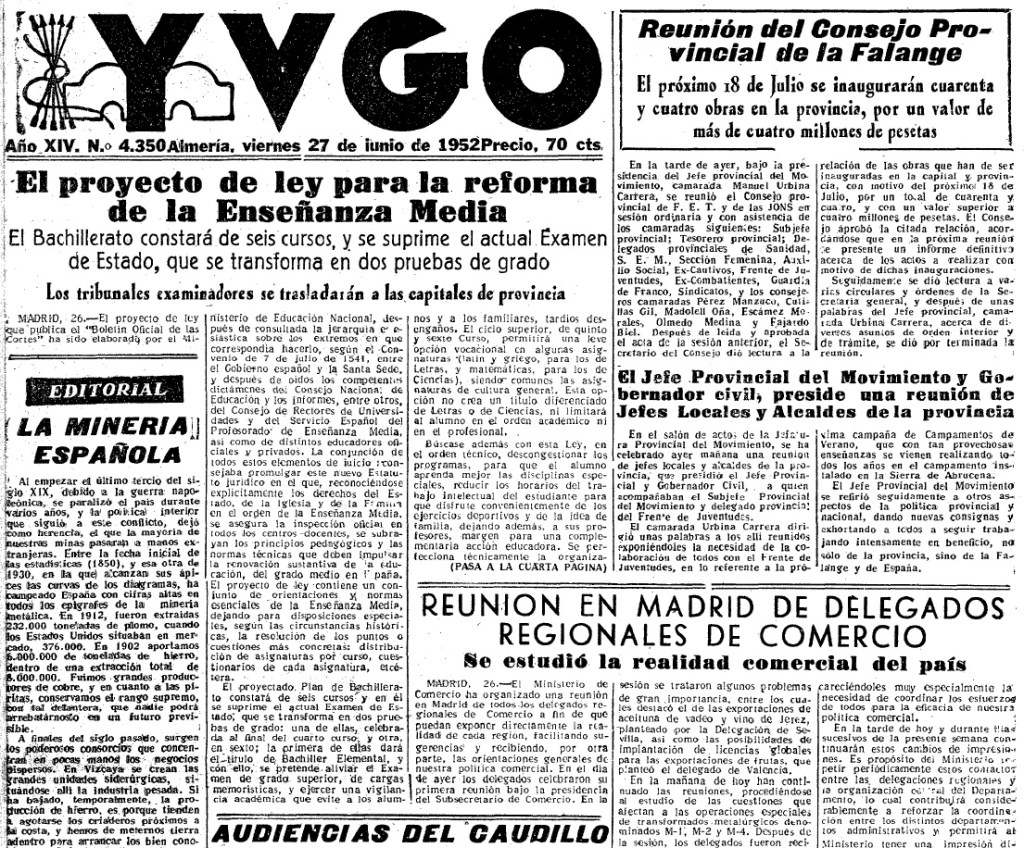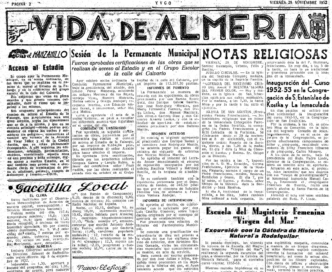 Se ocupó ayer la Permanente Municipal, en su sesión ordinaria, de las obras que se realizan en el camino de acceso al Estadio de la Falange (hoy, Estadio de la Juventud ‘Emilio Campra’) y en la edificación del grupo escolar de la calle del Calvario.