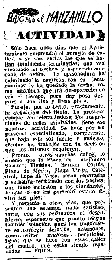 Pronto, otras muchas calles, lo mismo que la Plaza de Alejandro Salazar (hoy Manuel Pérez García), Tiendas, Hernán Cortés, Plaza de Marín, Plaza Vieja, Catedral, Lope de Vega, serán reparadas y se habrá terminado con los baches, que tanto molestan a los viandantes, tengan o no en perfecto estado físico sus pies.