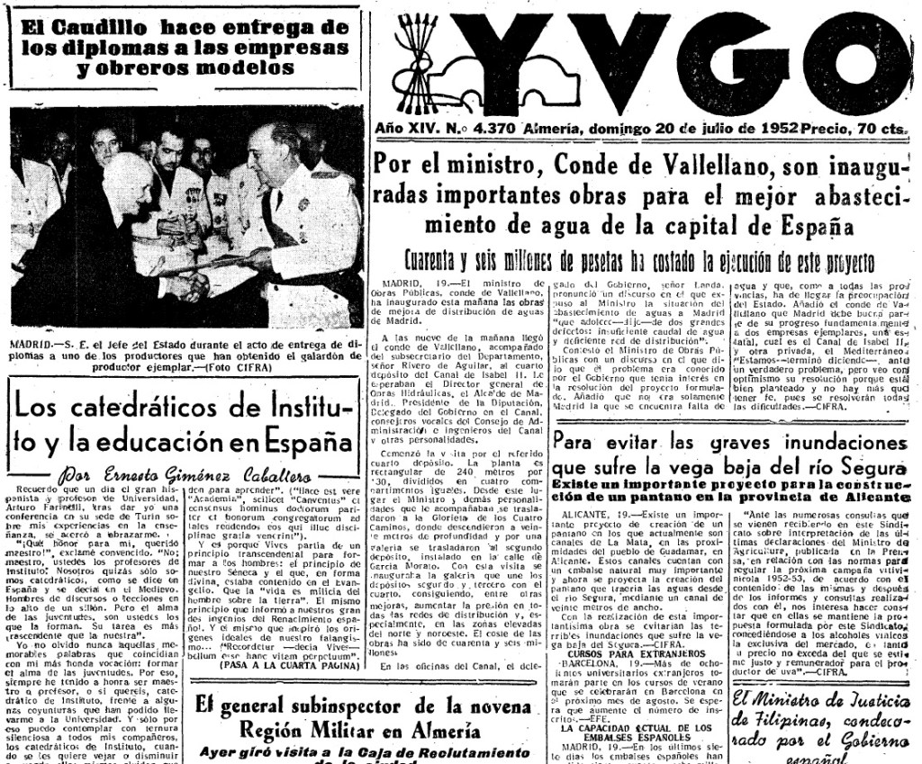 #BajoelManzanillo relata la transformación que sufren calles del centro al declararse la lucha contra los baches, asfaltándose numerosas vías que permiten corregir «defectos antañones». También se consigue en 1952 el acceso al Estadio de la Falange (hoy Estadio de la Juventud ‘Emilio Campra’), desde la avenida de Vivar Téllez (hoy, Cabo de Gata) por Ciudad Jardín, que se estrenó con el inicio de la liga 1952-53 (partido Almería-Cádiz, con triunfo local 3-0)