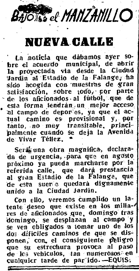 Nos ocupamos principalmente del camino de acceso al Estadio de la Falange, que propiamente será una gran avenida, según las dimensiones que se da a la misma, y que su rotonda principal -donde podrán permanecer en espera los coches y maniobrar sin peligro-, concurrirán el camino que arranca de la Avenida de Vivar Téllez y el de la Ciudad Jardín, que ya están plenamente franqueados. A ello seguirán las edificaciones, arbolado, pavimentación, etcétera, convirtiendo aquella zona en una preciosa y bella estampa, digno acceso a nuestro Estadio, en el que también muy pronto van a efectuarse obras de terminación de la pista de atletismo, patinaje, campos de baloncesto y frontón.