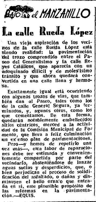 Una vieja aspiración de los vecinos de la calle Rueda López está siendo realidad: la pavimentación del trozo comprendido entre el Paseo del Generalísimo (hoy de Almería) y la calle Reyes Católicos, que aparecía con un adoquinado difícil y de molestísimo tránsito y que ahora quedará convertida en una calle llana y hermosa.
