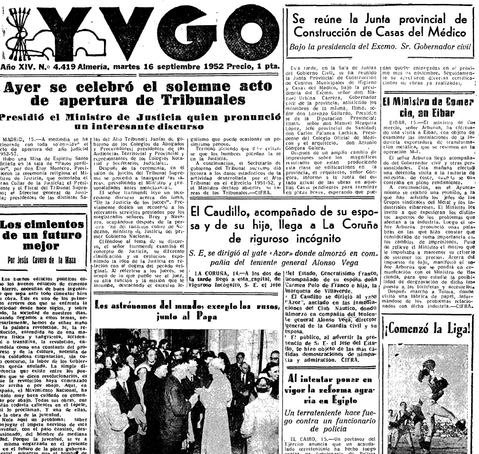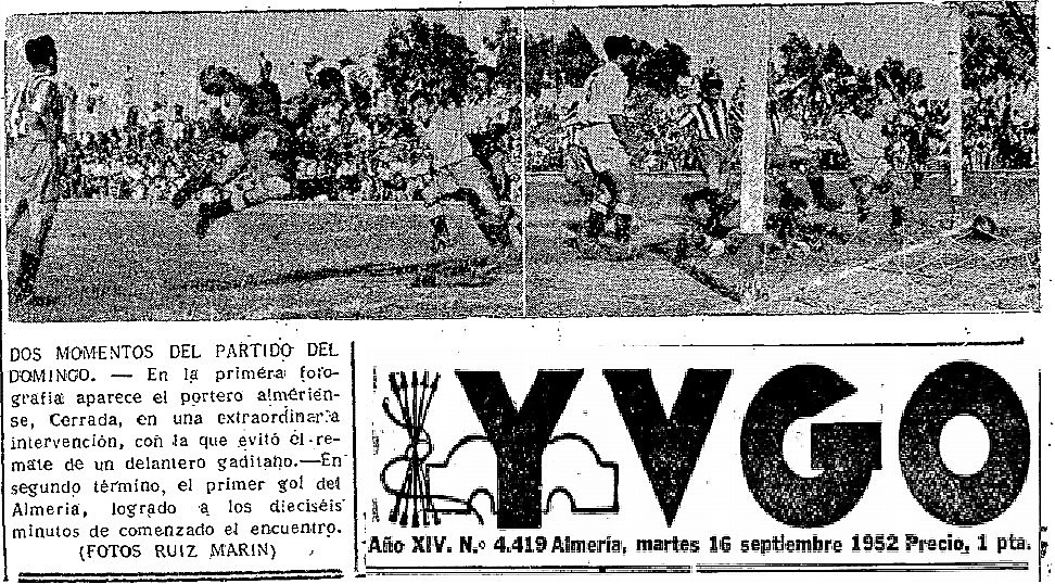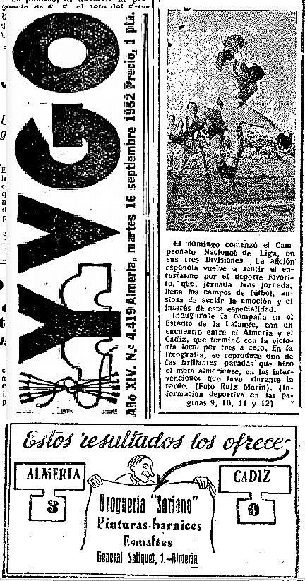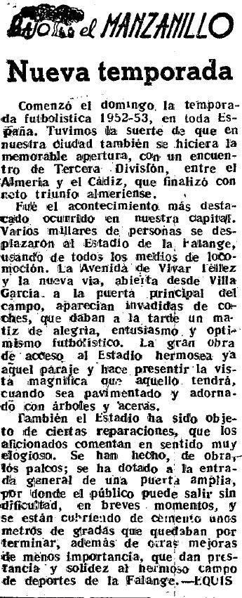 Comenzó el domingo la temporada futbolística 1952 – 53, en toda España. Tuvimos la suerte de que en nuestra ciudad también se hiciera la memorable apertura, con un encuentro de Tercera División, entre el Almería y el Cádiz, que finalizó con neto triunfo almeriense.