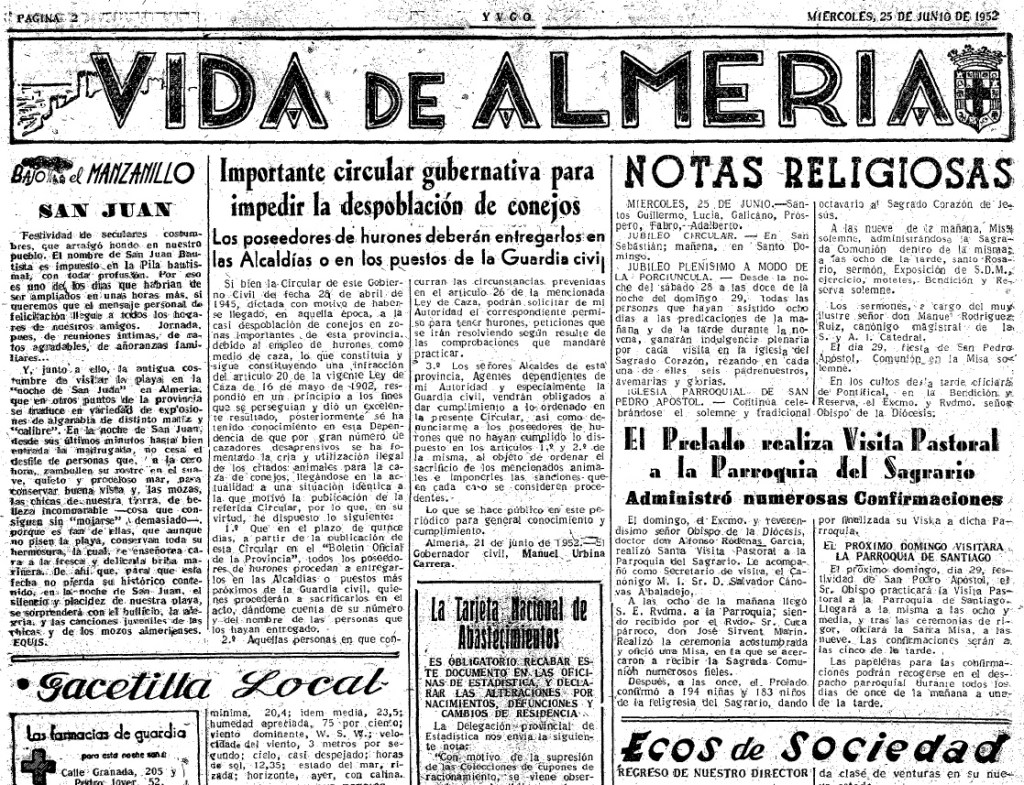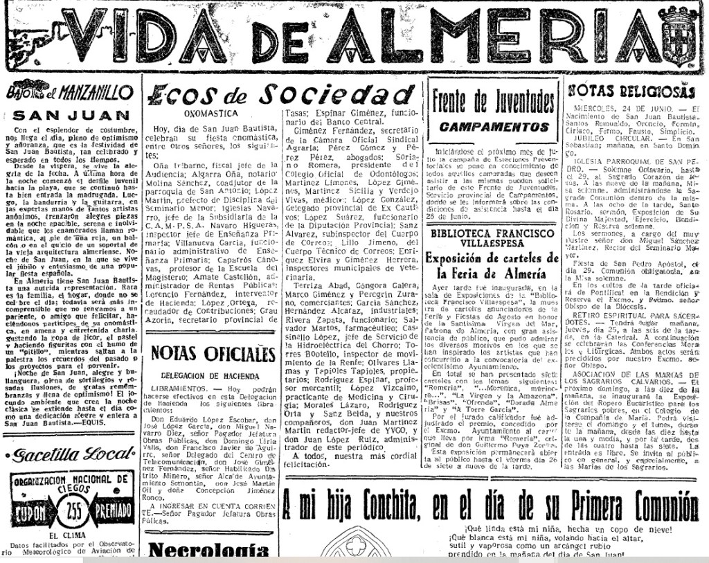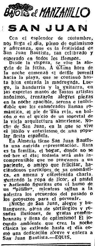 En Almería tiene San Juan Bautista una nutrida representación. Rara es la familia, el hogar, donde no se celebre el día; todavía será más incomprensible que no tengamos a un pariente o amigo que felicitar, haciéndonos partícipes de su onomástica, en amena y entretenida charla, gustando la copa de licor, el pastel y haciendo figuritas con el humo de un «pitillo», mientras saltan a la palestra los recuerdos del pasado o los proyectos para el porvenir.