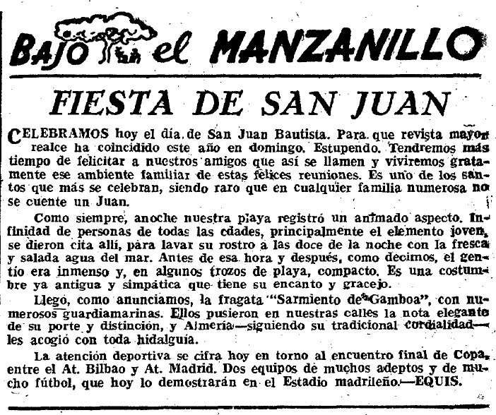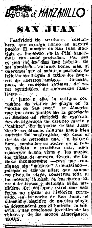 Y, junto a ello, la antigua costumbre de visitar la playa en la «noche de San Juan» en Almería, que en otros puntos de la provincia se traduce en variedad de explosiones de algarabía de distinto matiz y «calibre». En la noche de San Juan, desde sus últimos minutos hasta bien entrada la madrugada, no cesa el desfile de personas que, a la cero horas, zambullen su rostro en el suave, quieto y proceloso mar, para conservar buena vista y, las mozas, las chicas de nuestra tierra, de belleza incomparable -cosa que consiguen sin «mojarse» demasiado-, porque es tan de ellas, que aunque no pisen la playa, conservan toda su hermosura, la cual se señorea cara a la fresca y delicada brisa marinera. De ahí que, para que esta fecha no pierda su histórico contenido, en la noche de San Juan, el silencio y placidez de nuestra playa, se sorprenderá con el bullicio, la alegría y las canciones juveniles de las chicas y de los mozos almerienses.