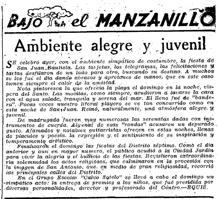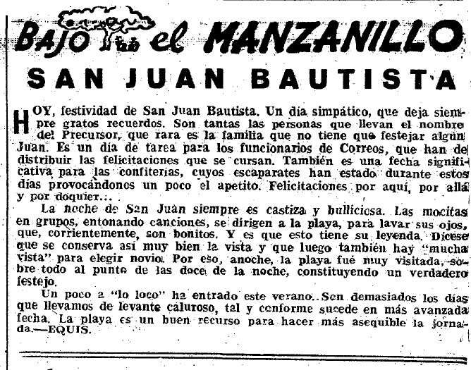 Nota pintoresca la que ofrecía la playa el domingo en la noche, víspera del Santo. Las mocitas, como siempre, acudieron a lavarse la cara con el agua salada, tranquila y serena del mar. El lleno fue de «bandera». Pocas veces nuestro litoral playero se ve tan concurrido como en esta noche de San Juan. Reinó, naturalmente, una atmósfera alegre y juvenil.