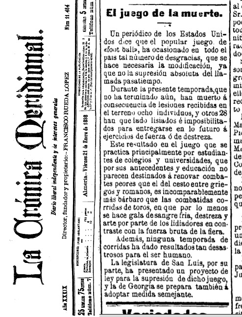 Más tarde, también ‘La Crónica Meridional‘ del 21 de enero de 1898, en una de sus gacetillas recoge una información de Estados Unidos donde afirman que el ‘foot – ball‘ es ‘El juego de la muerte‘ (titular), por el número de fallecidos y ‘lisiados‘, comparándolo con las corridas de toros. Esta es la noticia que comentan y donde habla de que las legislaciones de algunos estados norteamericanos iban a suprimir su práctica: