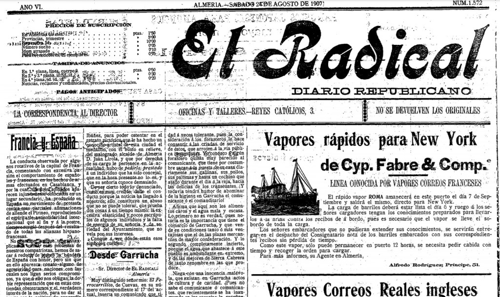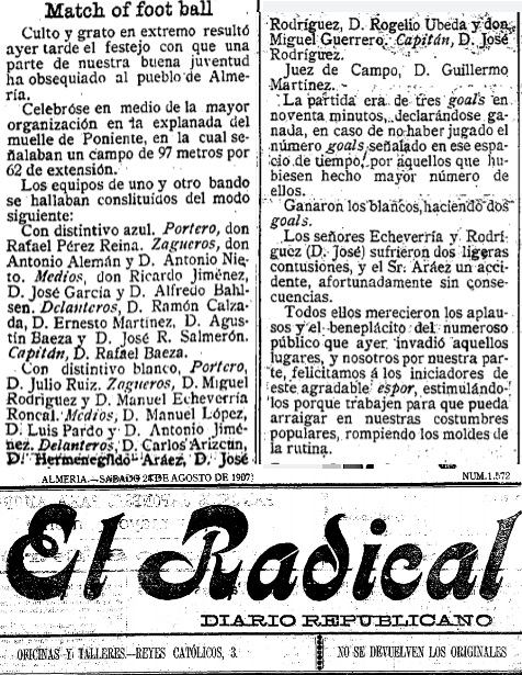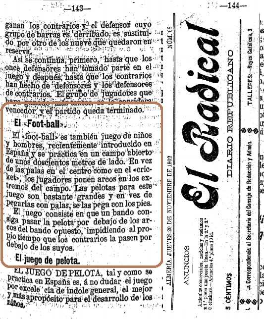 ‘El Radical’, diario republicano, del jueves, 20 de noviembre de 1902, en su portada, hablando de deportes – ‘cricket’, ajedrez, damas, pelota a mano, natación, equitación, bicicleta, baile…-, se refiere por vez primera en la prensa almeriense del siglo XX al «Foot – ball«, sobre el que escribe: