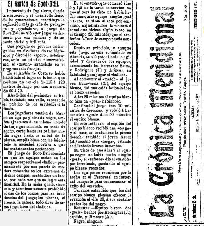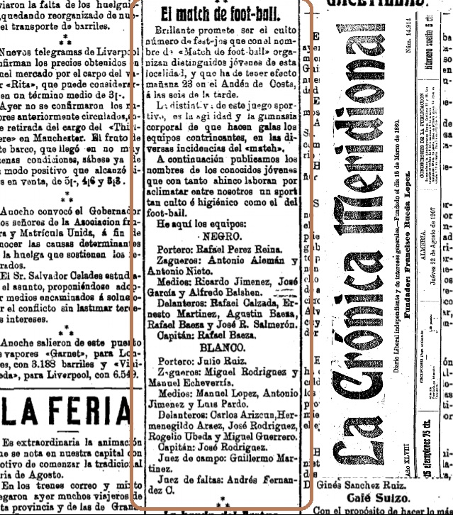 La información del partido, aparecida en «La Crónica Meridional» del 24 de agosto de 1907, es detallada y rigurosa. Así comenzaba el cronista: «Importado de Inglaterra, donde la educación y el desarrollo físico de las generaciones, constituye la aspiración más grande de pedagogos y legisladores, el juego del Foot- Ball se vio ayer jugar en Almería por vez primera y de un modo oficial y brillante. Una pléyade de jóvenes distinguidos, cultivadores de ese higiénico y distraído sport, celebraron, ante un público numerosísimo, el match anunciado en el programa de festejos«.