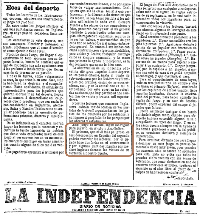 Albert Ramírez Orchells, en ‘Ecos del Deporte‘, portada de ‘La Independencia‘, del 5 de marzo de 1909, habla del ‘foot – ball‘, que «es, entre todos los juegos atléticos, el que más partidarios cuenta en Inglaterra, en cuyo país se considera fiesta nacional«. Tras elogiar las virtudes del ‘sport’, comenta que, «se divide, según las reglas para jugarlo, en Rugby y Assotiation«. Para agregar que «el primero, que es el más peligroso, es casi desconocido en España; del segundo podrán recordar los lectores, por el jugado hace dos ferias en el contramuelle (agosto de 1907, ya suficientemente documentado) y por algunas partidas jugadas por marinos ingleses durante las visitas de su escuadra a nuestro puerto«.