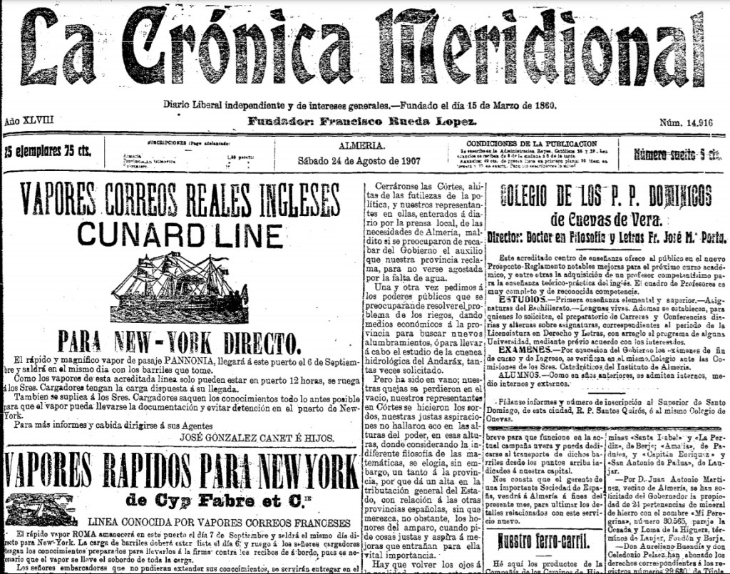 La primera referencia al ‘foot – ball’ que encontramos en la prensa almeriense corresponde a ‘La Crónica Meridional‘ del 22 de diciembre de 1895 (costaba el periódico 5 céntimos de peseta). El diario de finales del siglo XIX registra que han recibido en la redacción el último número de la revista «Crónica del Sport«, donde destacan ilustraciones de caza y bellas artes, según reflejan. Después enumera la información que ofrece y ahí aparecen los siguientes deportes: caza, colombófila, tiro de pichón, yachting, agricultura, hípica, automovilismo, cricket, atléticos, velocídia, boxing, tauromaquia, pelotarismo y ‘foot-ball‘». Es la primera vez que en la prensa local se habla del fútbol.