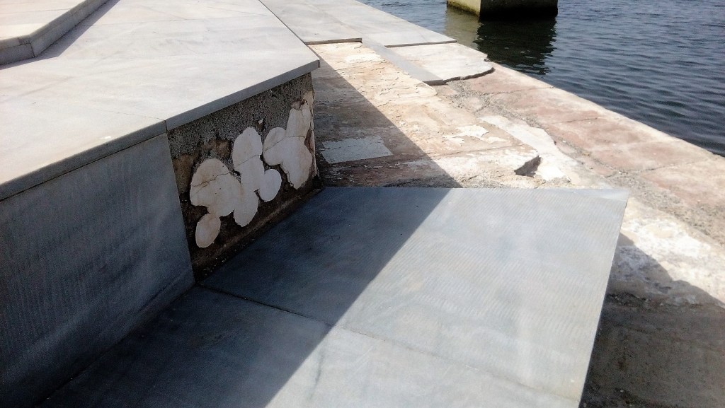 Pero, cual no es nuestra sorpresa, cuando si seguimos más adelante, adentrándonos en el mar, nos encontramos con otro espectáculo bochornoso: el amasijo de hierros del géiser que nunca más funcionó y del que nunca más se supo, emergente como símbolo de la dejadez. Y, a ello, hay que añadir como nuevo que la Ballena de Gabriel, otro lugar emblemático, al que acuden propios y extraños, se nos cae a pedazos, losa a losa, trozo de mármol a trozo de mármol. Una obra de reciente realización, pues la zona de la Ballena, del gran pescaíto, se reabrió tras una inversión de más de 182.000 euros por parte del Ayuntamiento, el 2 de enero de 2019. Han pasado poco más de dos años y el espacio urbano se desmorona. No sabemos si por las inclemencias del tiempo -el azote del viento y del mar- o bien por la acción de gamberros que sin escrúpulos están desmontando la pavimentación en mármol que se realizó. El hecho es que hay un buen tramo con el cemento al aire y si miramos al mar, nos encontramos las losas allí, en la profundidad de la desembocadura.